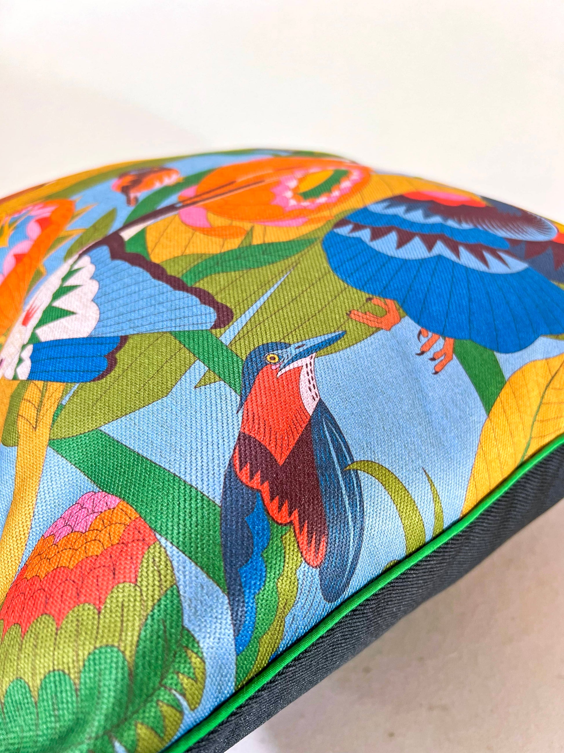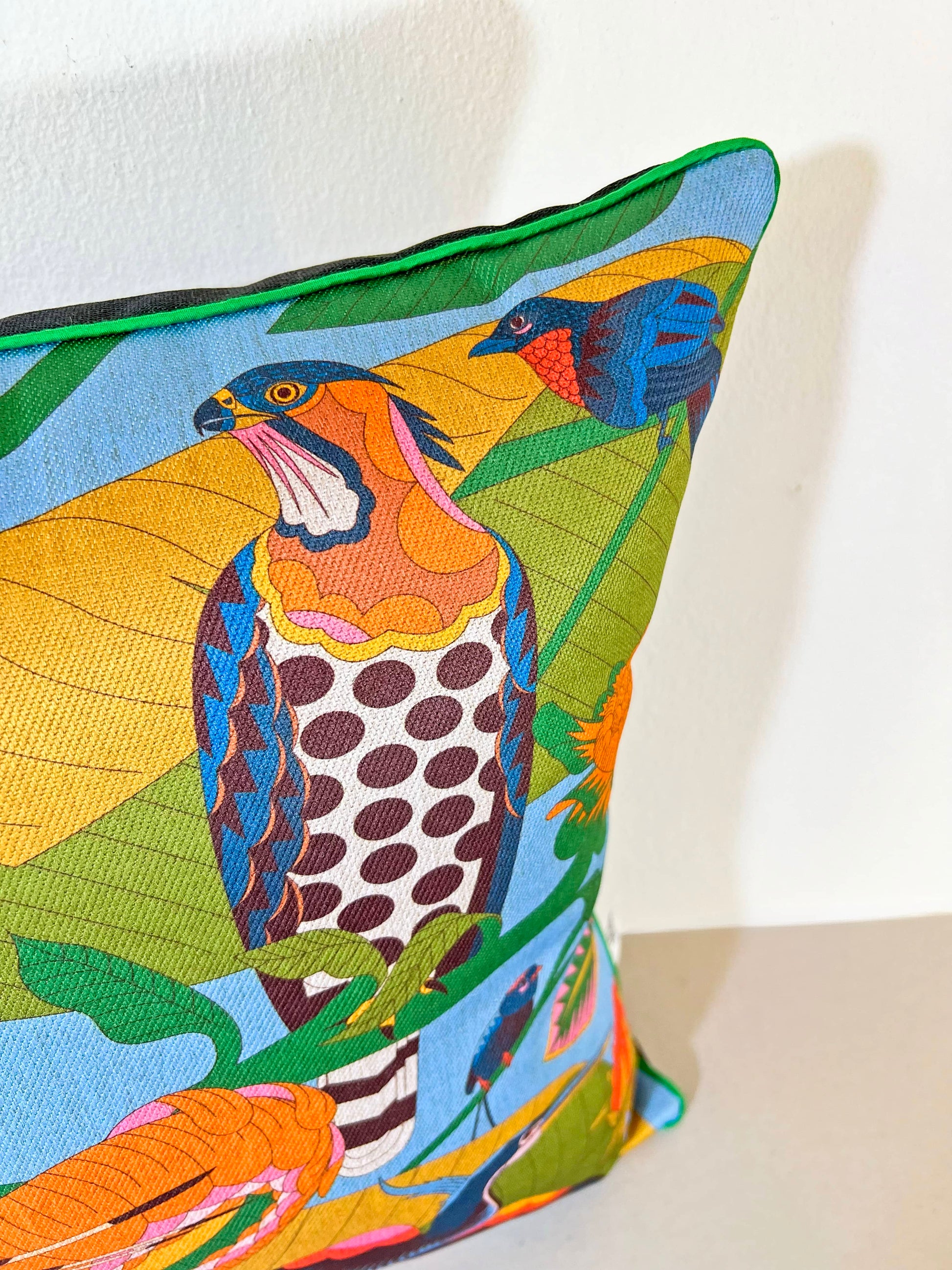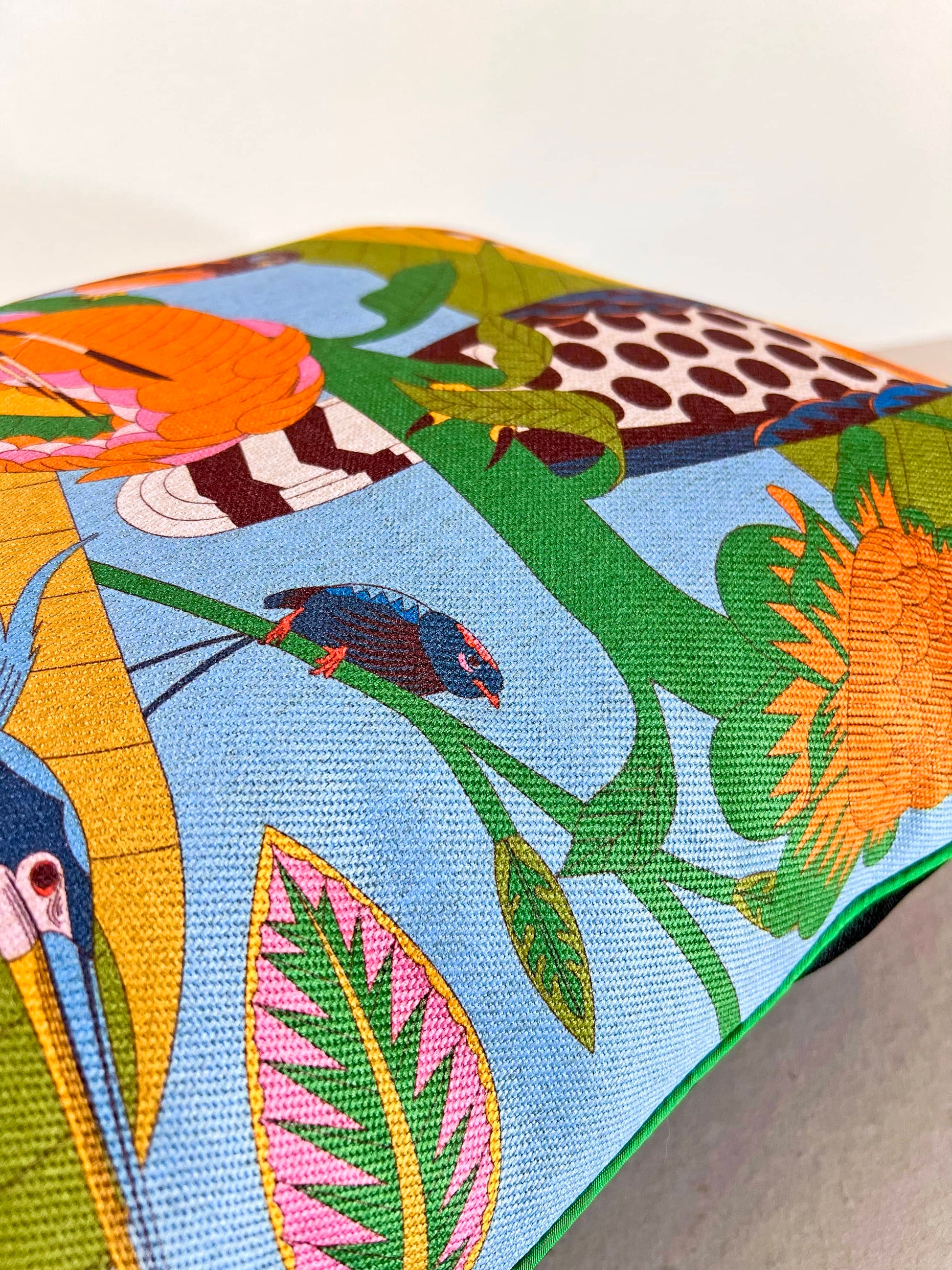 Adentrate a un mundo de tranquilidad con los almohadones de la colección Aves del Paraíso. Diseñado para aportar serenidad este cojín es una ventana a un exuberante jardín tropical.