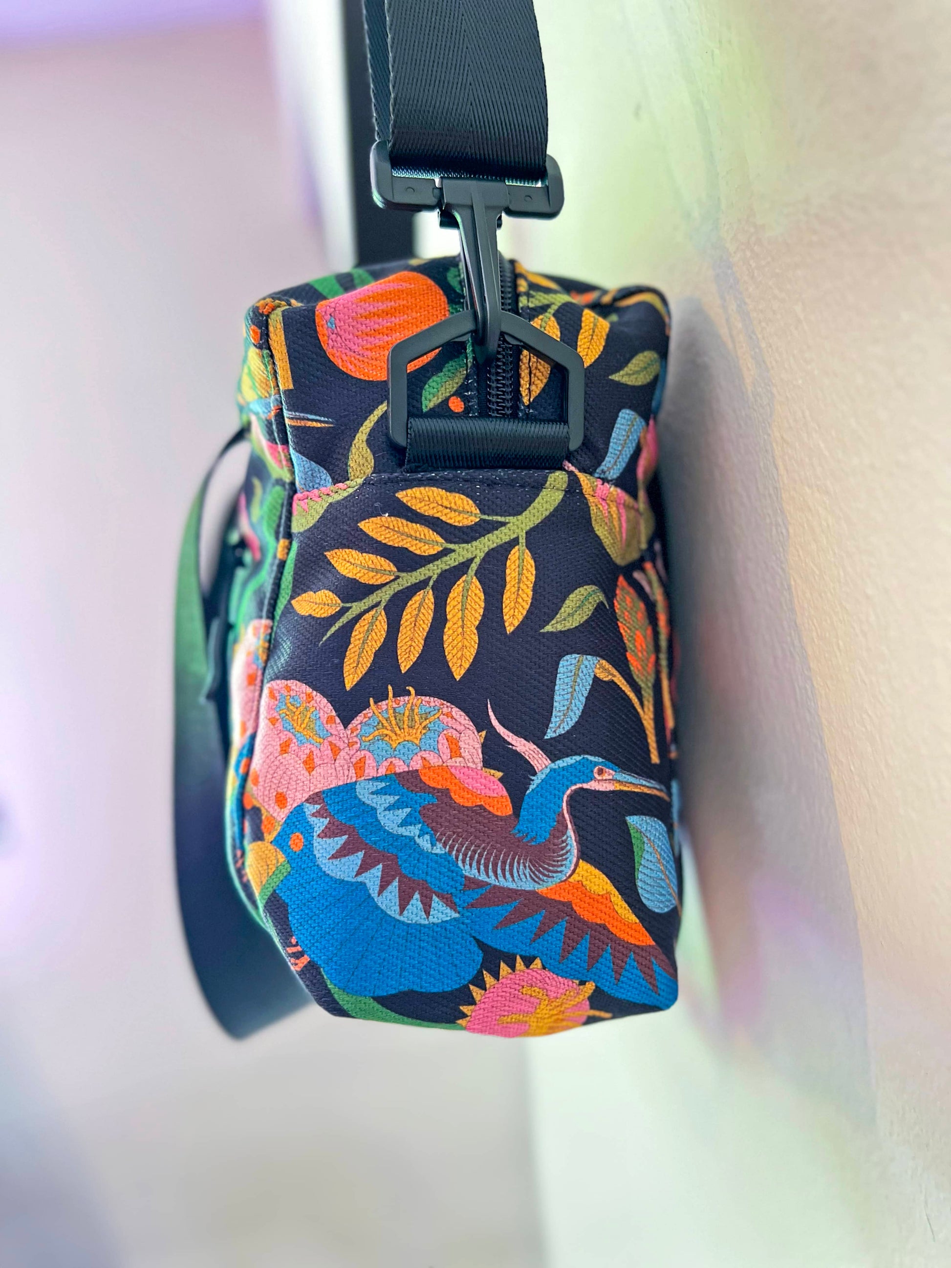 Este bolso cruzado de la colección Aves del Paraíso, es el compañero perfecto para mantener tus pertenencias en orden a la hora de salir de casa, con dos bolsillos externos de fácil acceso y dos bolsillos internos, uno de ellos con zipper, perfecto para guardar objetos de valor como llaves o dinero. La tira de hombro ajustable y removible te permite usarlo como bolso cruzado para mayor comodidad o llevarlo de mano. Este hermoso bolso no es solo un accesorio, es una pieza de arte funcional que celebra la naturaleza y el color de una manera única.