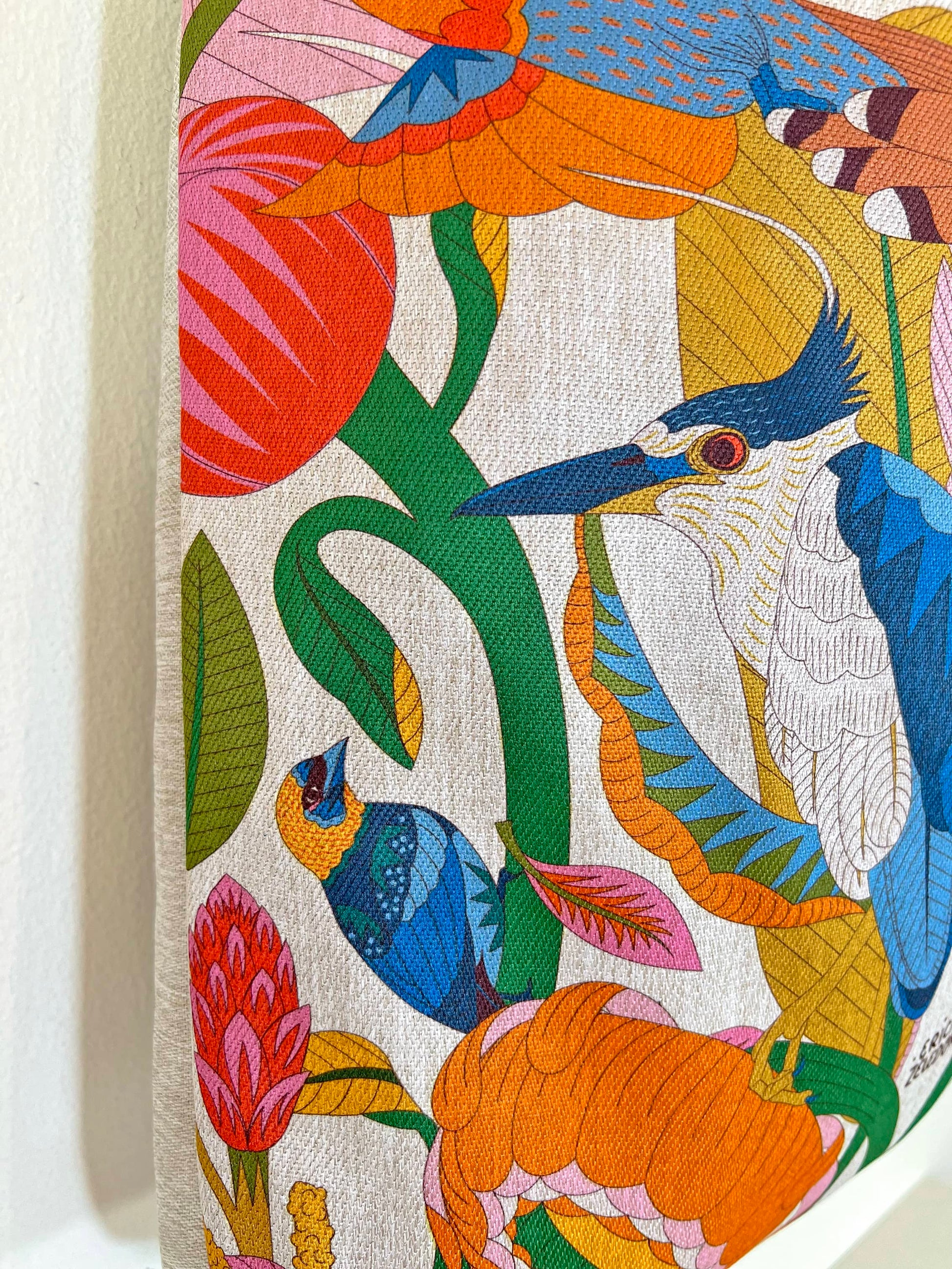 Este colorido bolso grande de la colección Aves del Paraíso, es una pieza de arte funcional para el uso diario, con un diseño livano, espacioso y resistente, este bolso destaca por su ilustración vibrante donde las aves son las protagonistas, el Pájaro Sombrilla, la Garza Nocturna y el colorido Cuco Ardilla.
