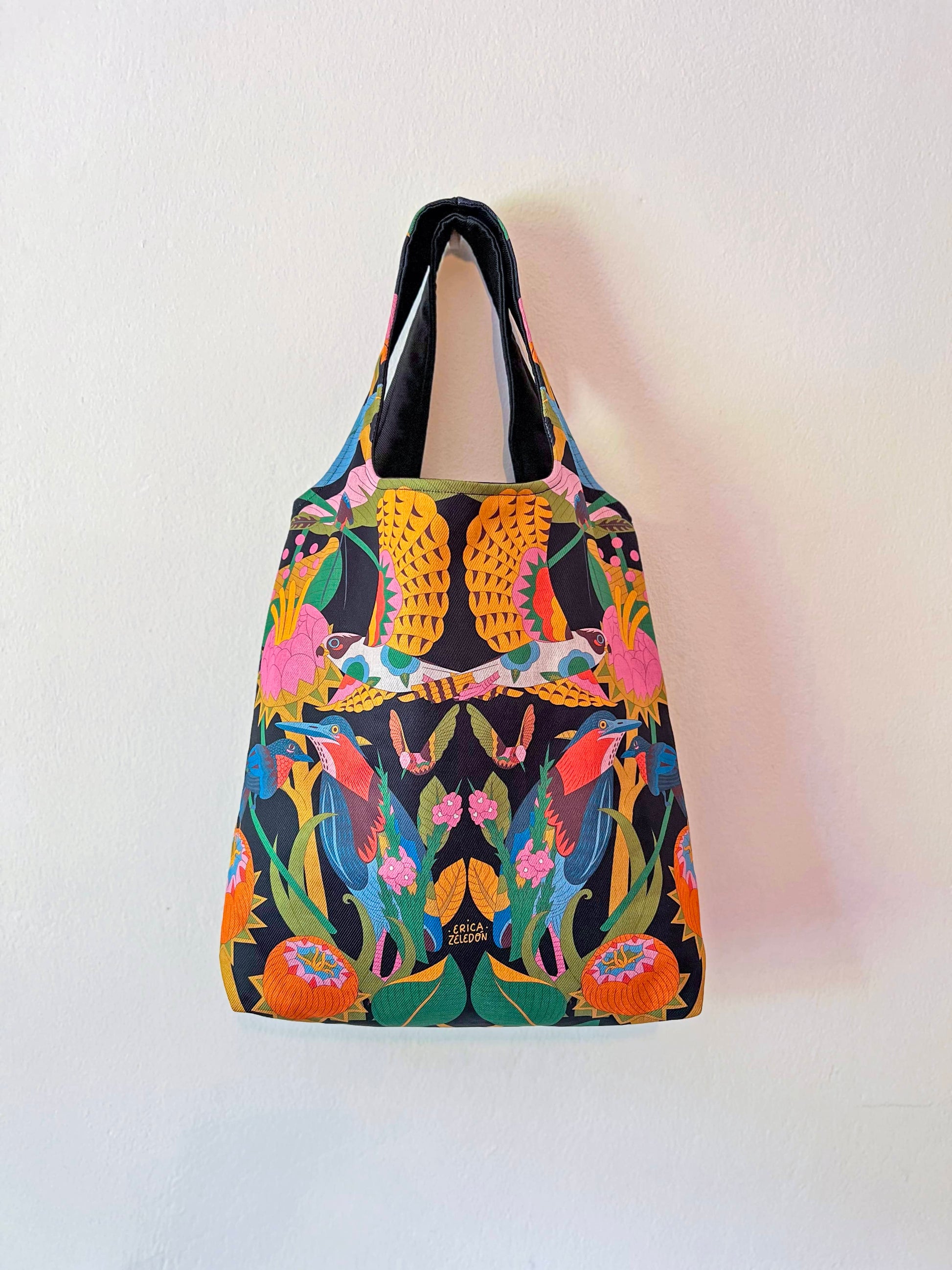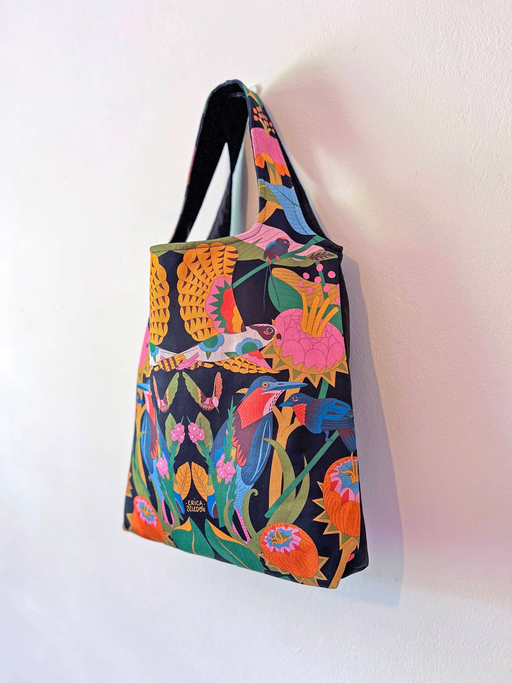 Este diseño de bolso grande de la colección Aves del Paraíso evoca la magia del bosque con la presencia del guaco, la garza verde, la quérula gorgimorado y el toledo saltarín. Un bolso pensado para ser funcional, espacioso, cómodo y a parte de ello con una estética vibrante.