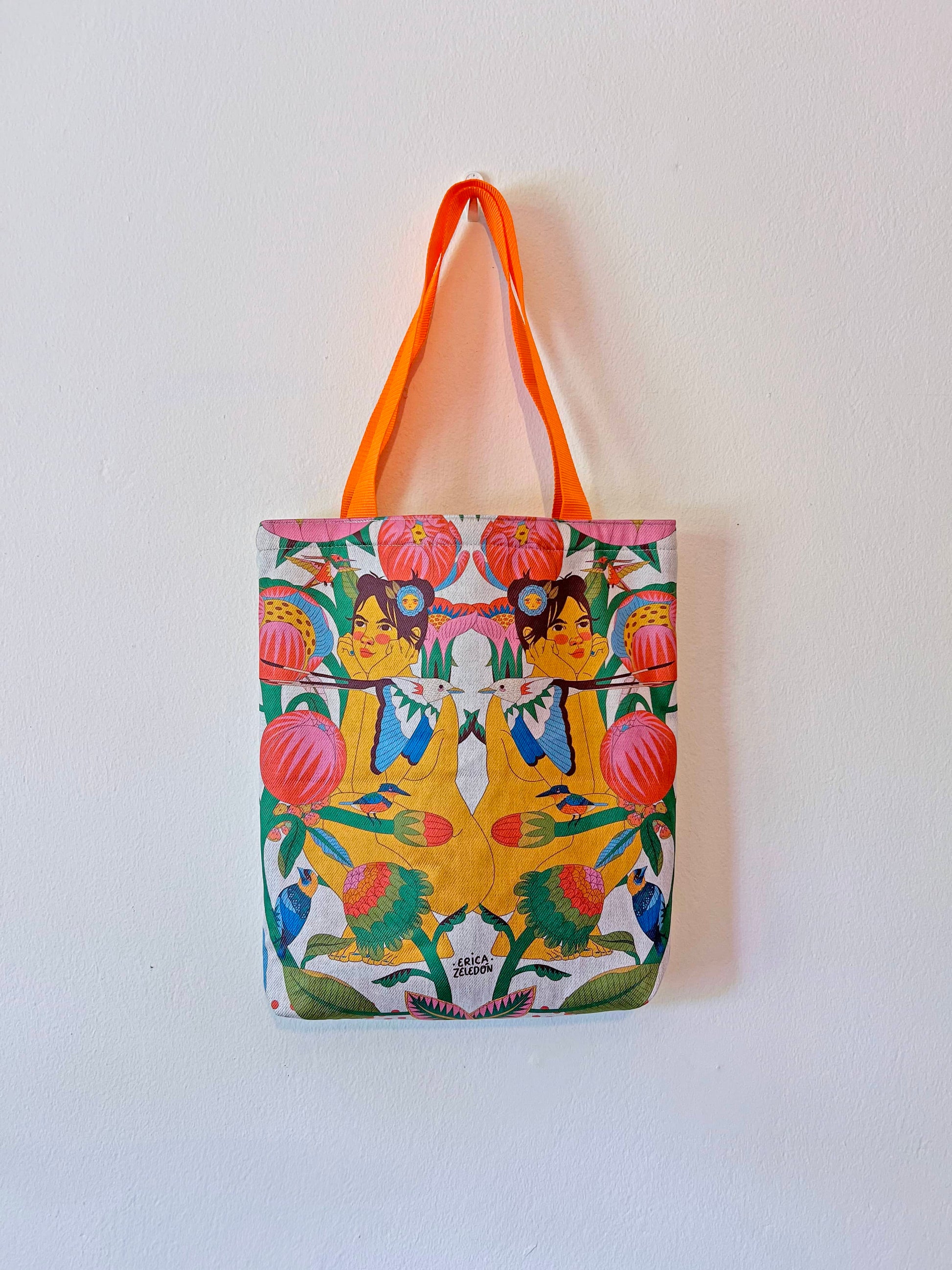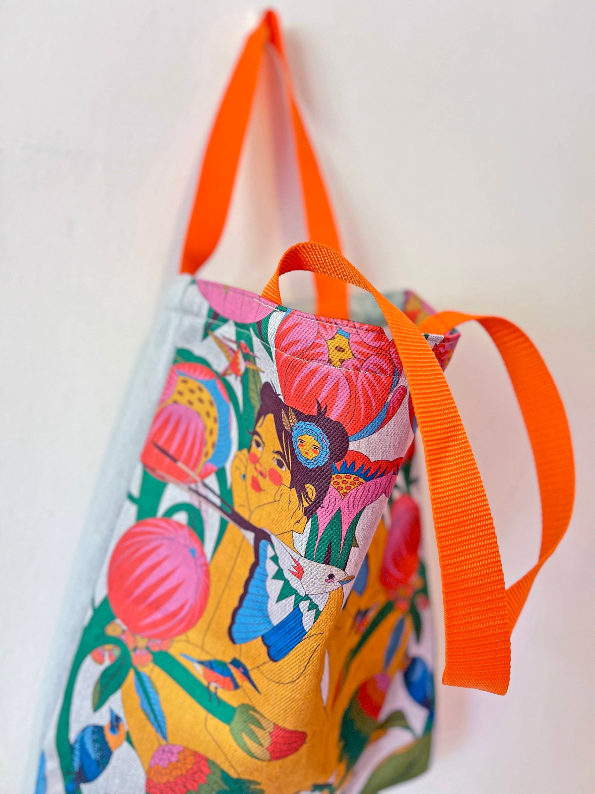 Este bolso mediano lleno de color de la colección Aves del Paraíso es una invitación a percibir la profunda conexión entre las personas y el vibrante mundo natural. La ilustración central presenta a una mujer en un estado de contemplación, absorbiendo la energía y la paz de su entorno. Las aves, como la elegante tijereta rosada, el ágil martín pescador y la vivaz caciquita, son guardianes de esta escena idílica, llenando el diseño con color y dinamismo. Cada detalle de esta pieza ha sido creado para recordarte el poder de la quietud y la belleza del mundo natural.