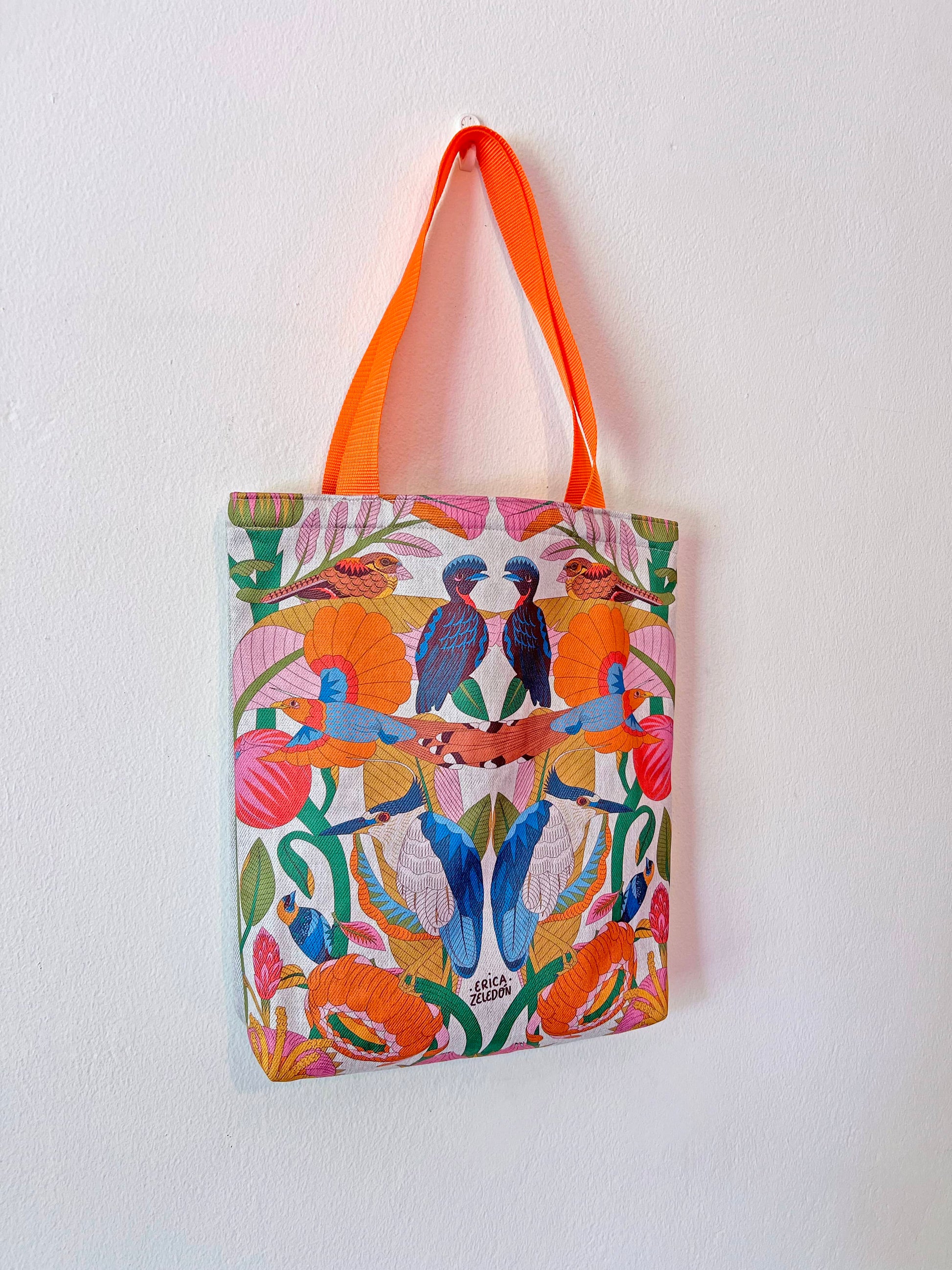 Este colorido bolso mediano de la colección Aves del Paraíso, es una pieza de arte funcional para el uso diario, con un diseño livano, cómodo y resistente, este bolso destaca por su ilustración vibrante donde las aves son las protagonistas, el Pájaro Sombrilla, la Garza Nocturna y el colorido Cuco Ardilla.