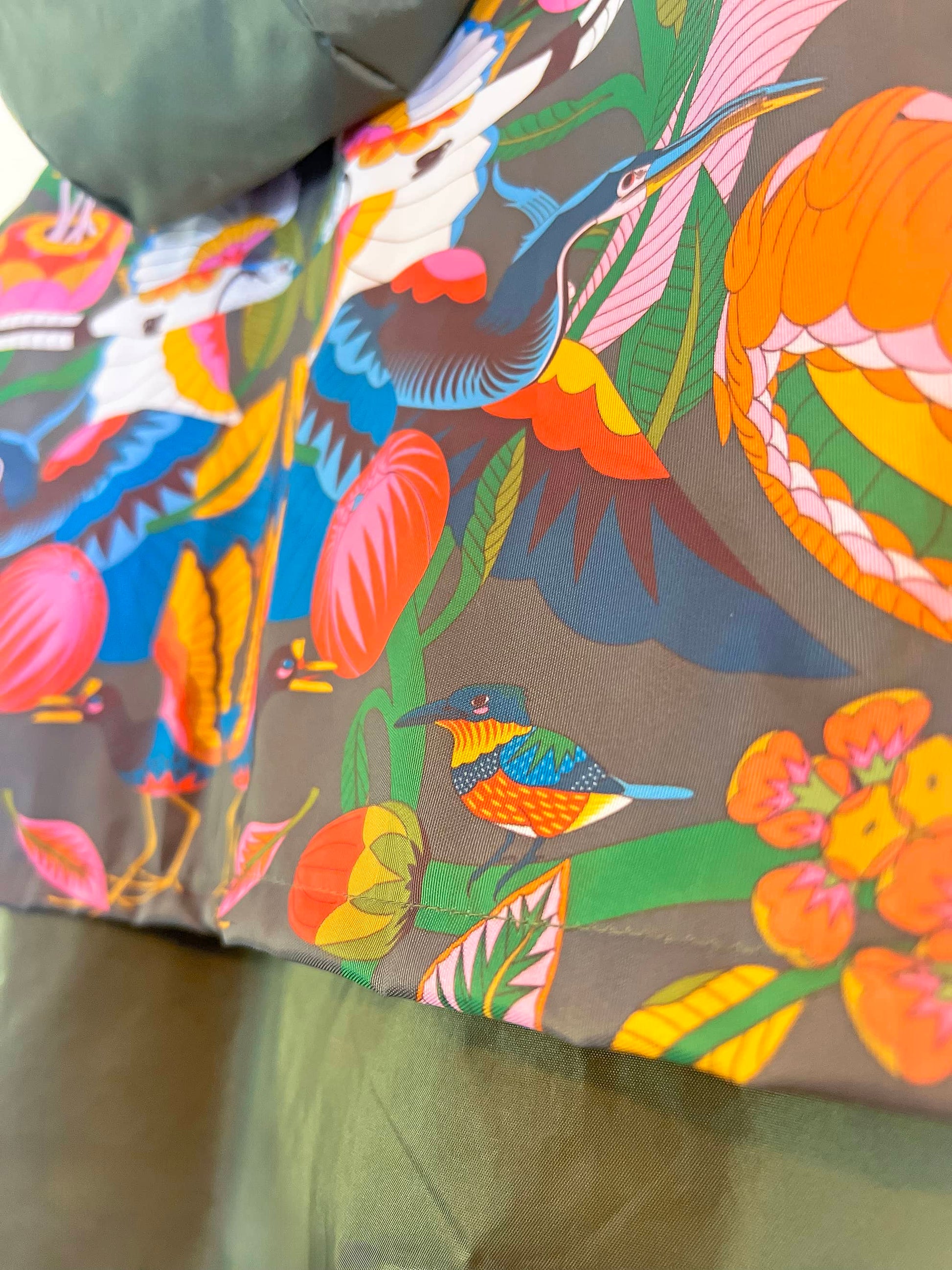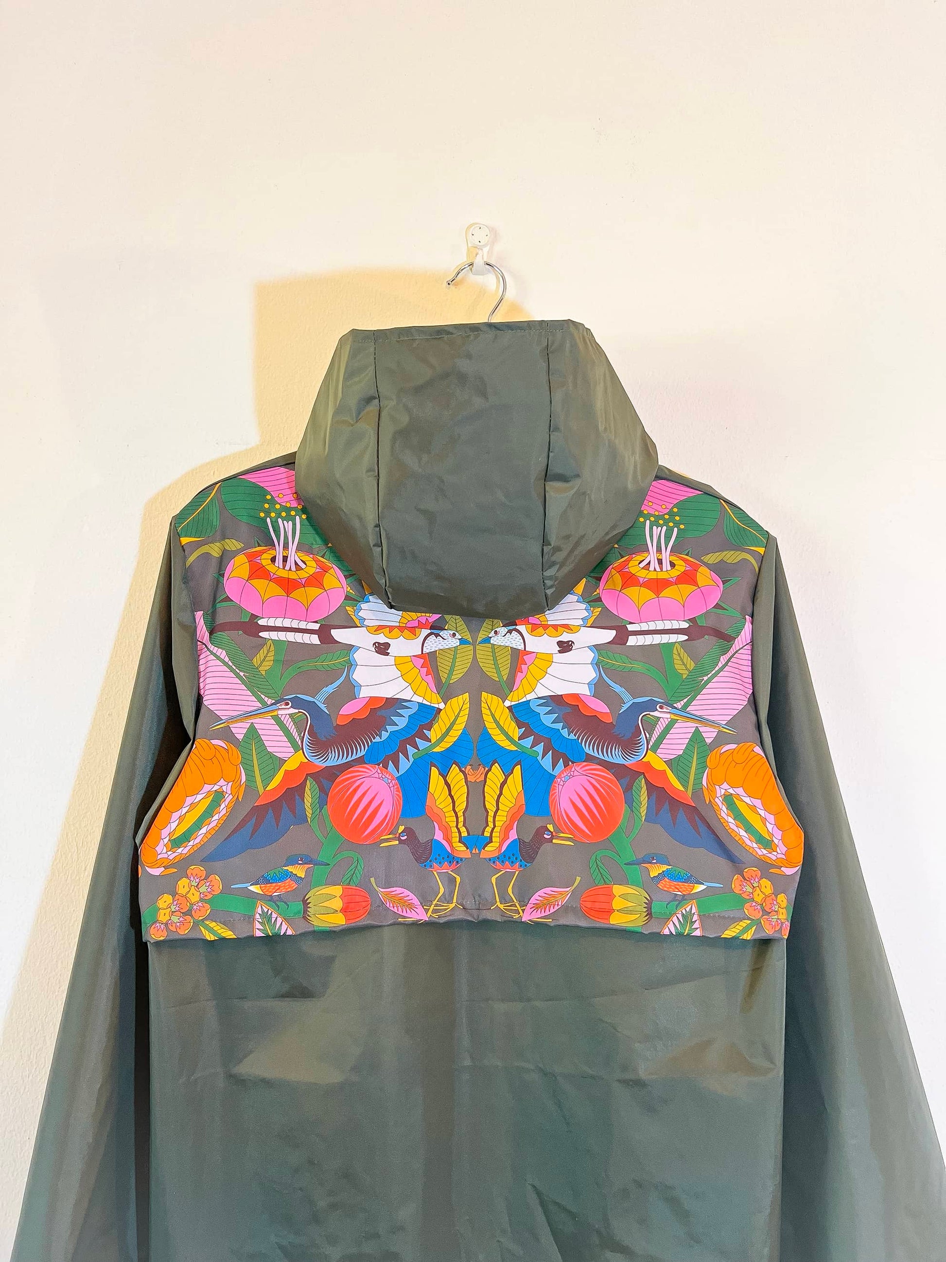 Esta capa impermeable de la colección Aves del Paraíso de Erica Zeledón es una celebración a la majestuosidad de las hermosas aves de Costa Rica, con una ilustración detallada y llena de color, esta prenda busca no solo ser funcional al ser impermeable si no también ser un objeto de diseño donde vos serás protagonista.