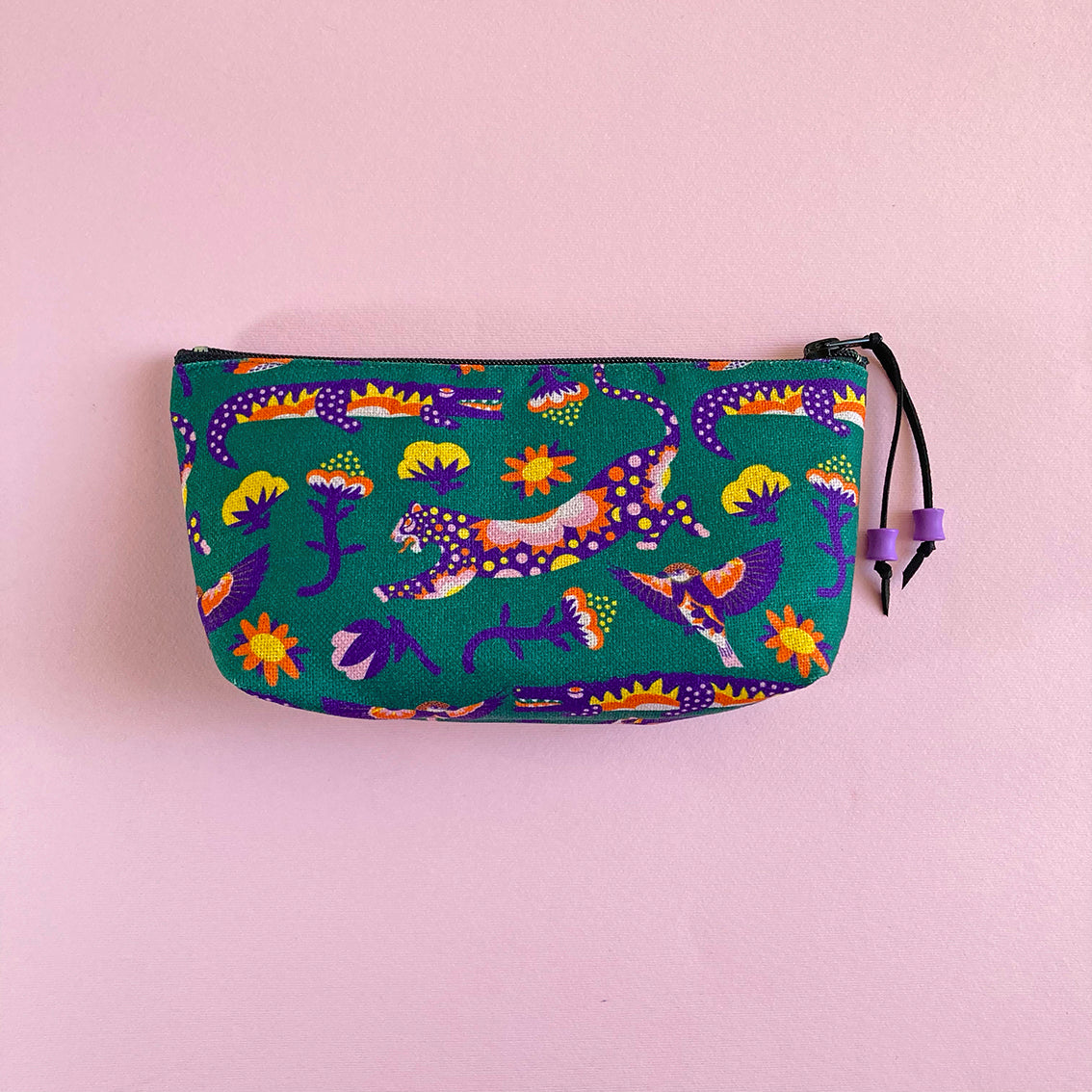 La Cosmetiquera Patrón animales con fondo verde de Erica Zeledón es una pieza funcional y artística que captura la esencia de la fauna tropical costarricense. Perfecta para quienes buscan un accesorio lleno de color y vida.