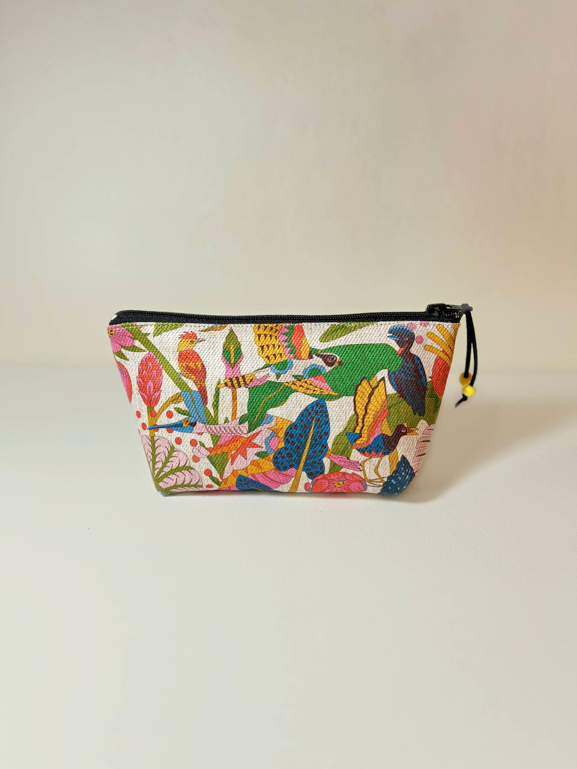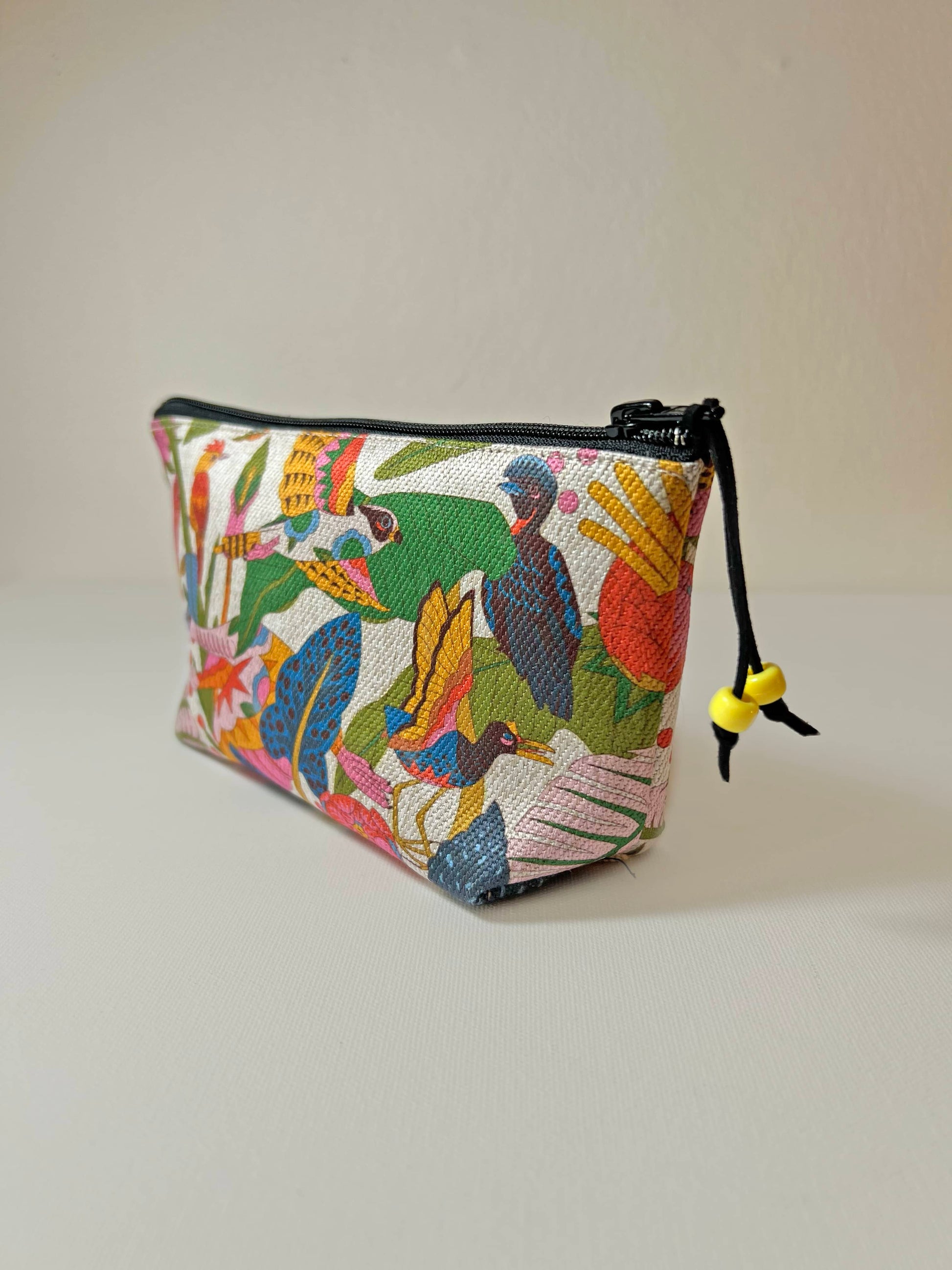 Esta vibrante cosmetiquera de la colección Aves del Paraíso tiene un diseño inspirado en un ecosistema lleno de vida, donde destacan aves exóticas como el rapaz conocido en Costa Rica como Guaco, la elegante jacana y la espectacular espátula rosada, envueltas entre hojas tropicales y flores multicolores.