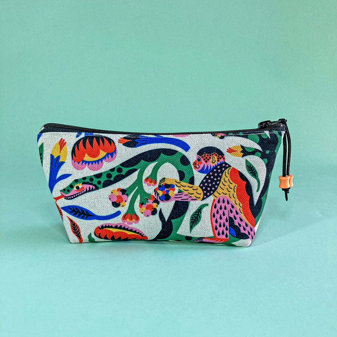 La Cosmetiquera Mono con fondo claro de Erica Zeledón captura la esencia juguetona de los monos costarricenses en un diseño funcional y estilizado. Perfecta para quienes buscan un accesorio práctico inspirado en la fauna tropical de Costa Rica.