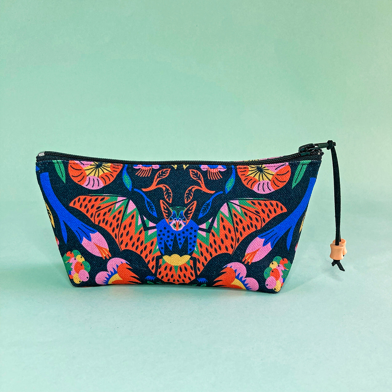 La Cosmetiquera Murciélago (fondo negro) de Erica Zeledón es un accesorio que captura el misterio y elegancia del murciélago tropical en un diseño artístico y estilizado.