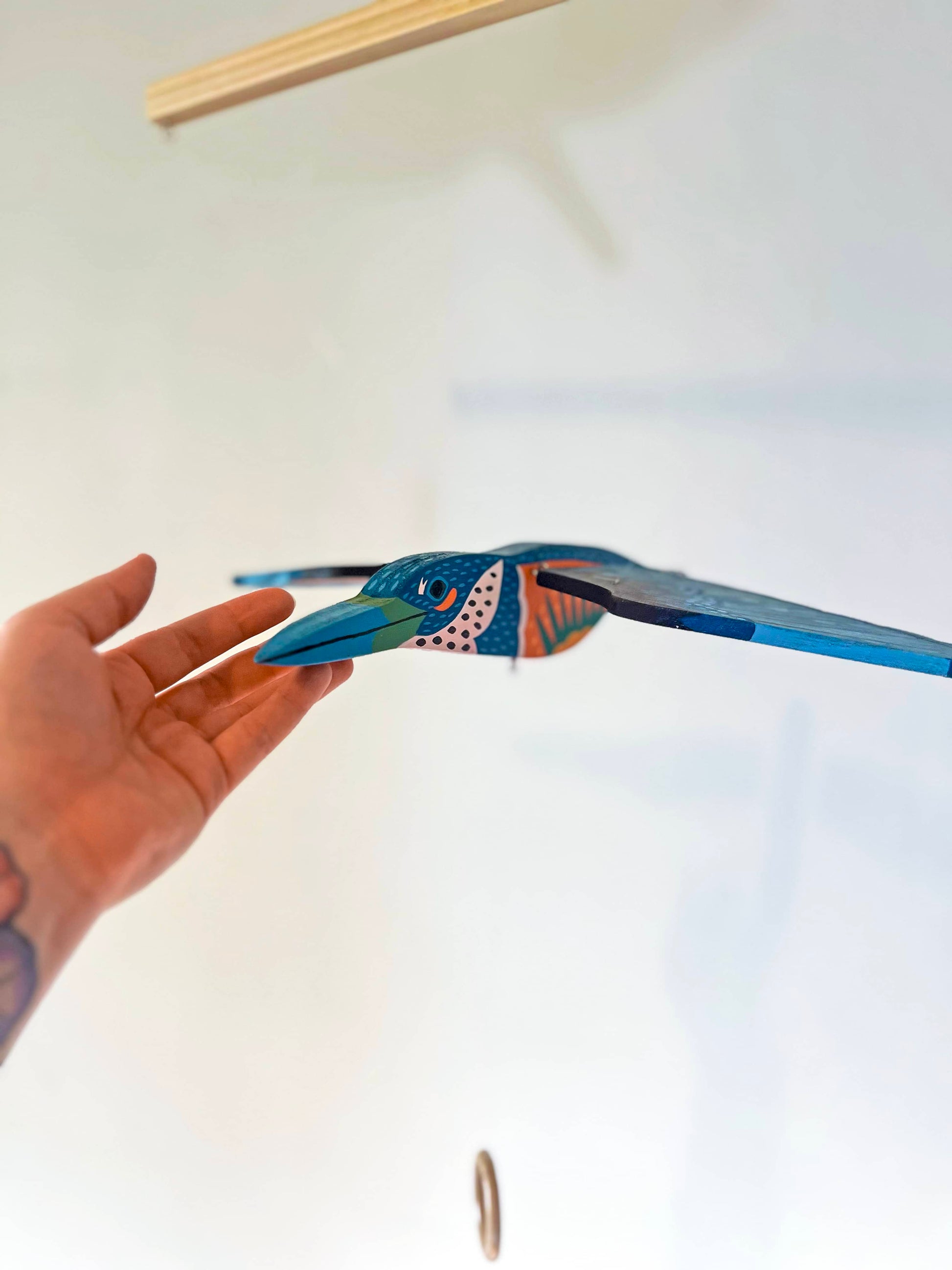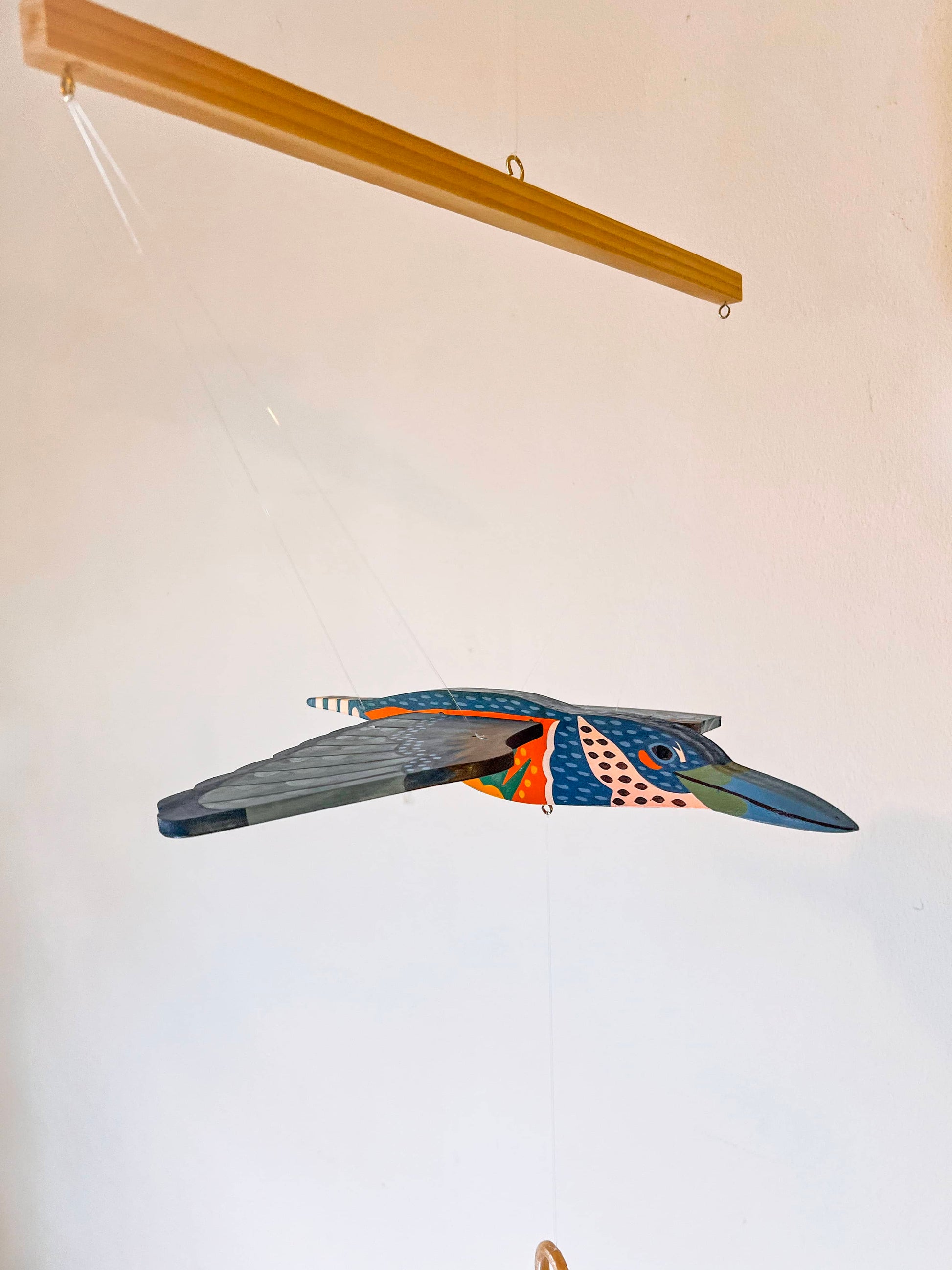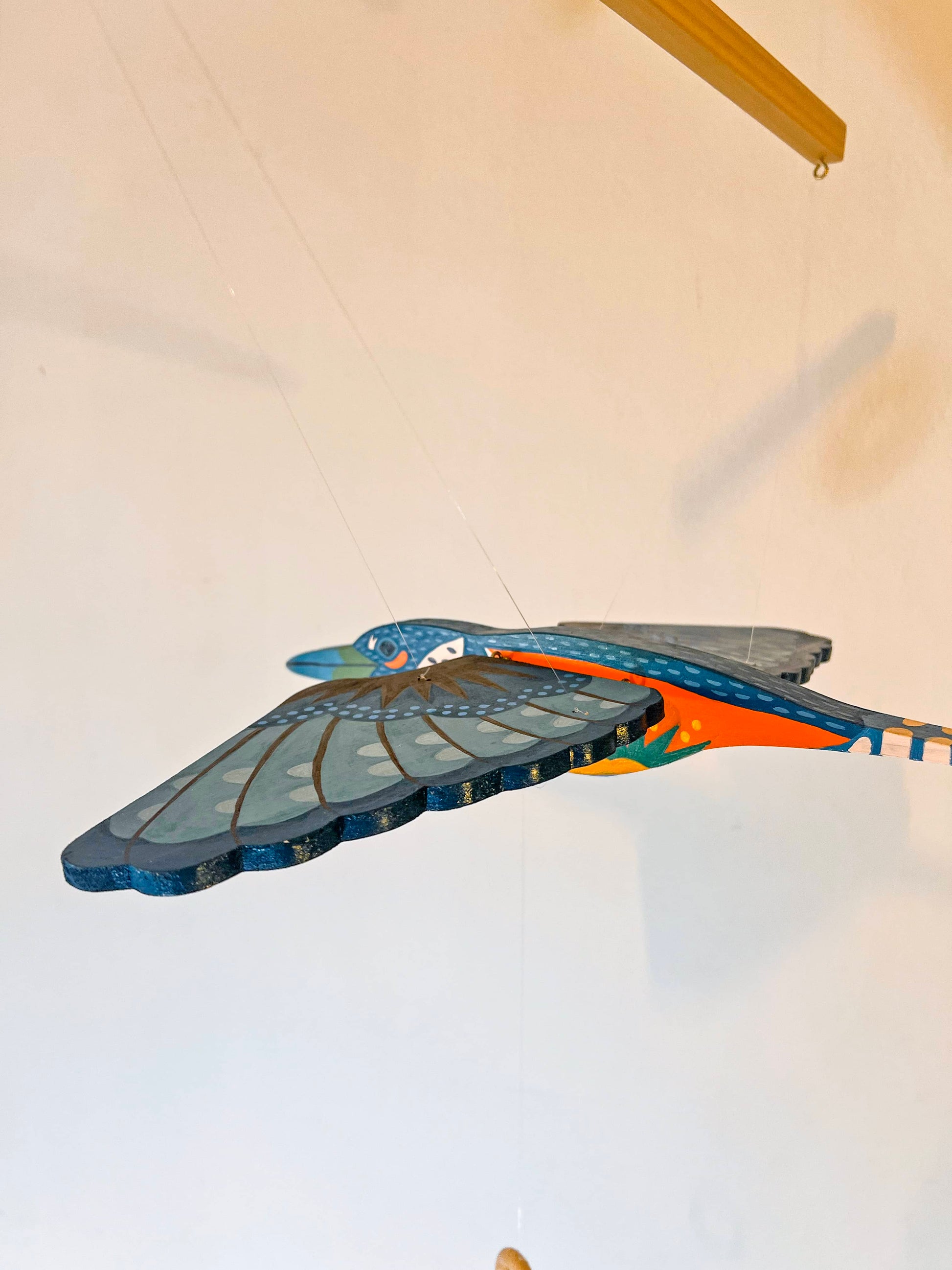 Este hermoso móvil parte de la colección Aves del Paraíso es una pieza artesanal en pino pintada a mano en acrílico por la artista Erica Zeledón, lista para colgarse en cualquier espacio que querás resaltar.
