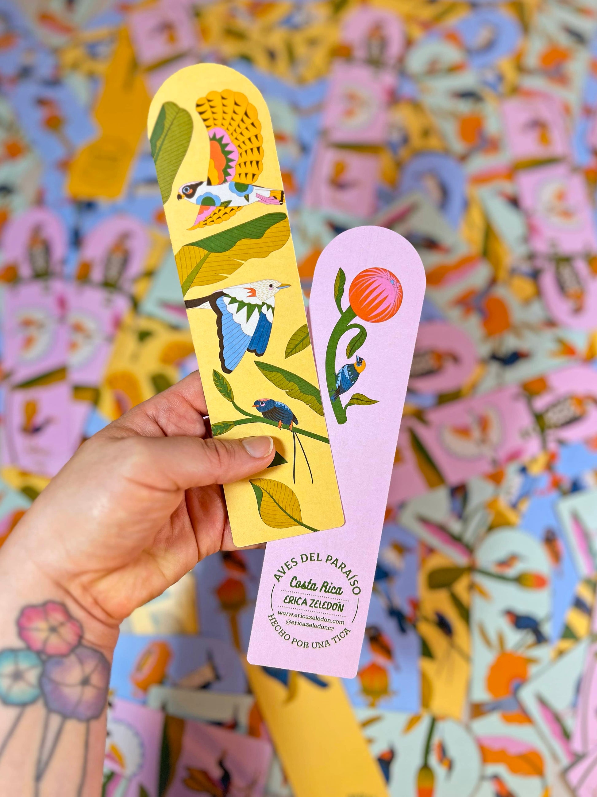 4 separadores de libros de la colección Aves del Paraíso ilustrados por Erica Zeledón, una muestra de algunas aves emblemáticas de Costa Rica.